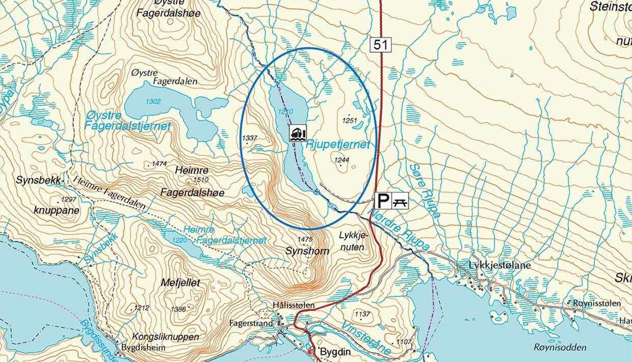 Folgen Sie der Rv51 nordwärts durch Beitostølen und am Bygdin vorbei bis über die Brücke über die Nørdre Rjupa. Hier ist ein großer Parkplatz angelegt. Ein alter Karrenweg führt westwärts zum Ufer des Rjupetjednet.