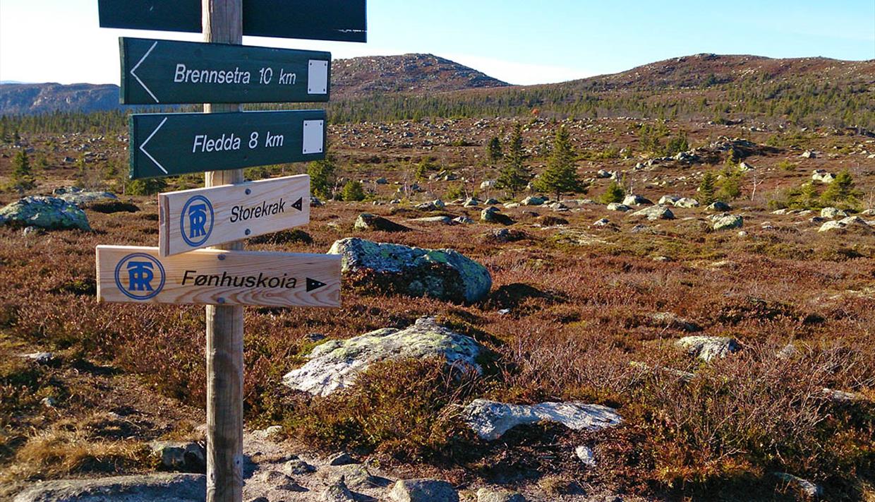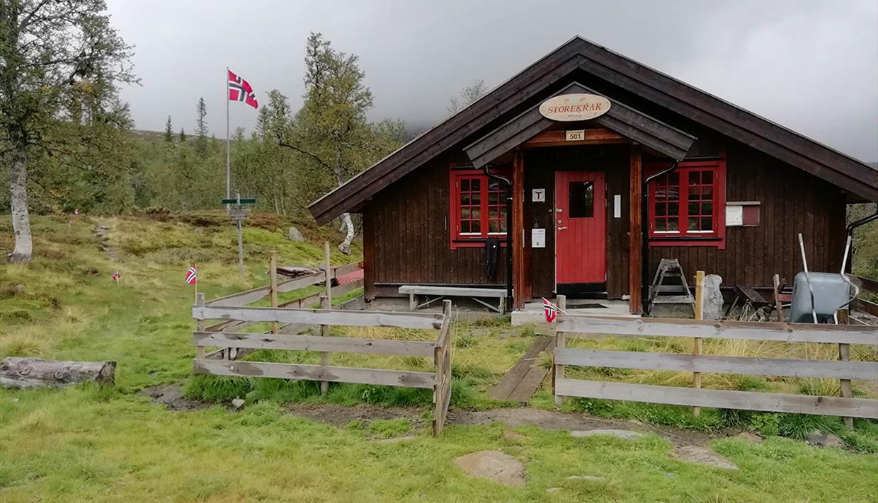 Von der Brücke Bogbua folgen sie dem für motorisierten Verkehr gesperrten Fahrweg 6 km bergan zur Storekrakkoia. Hier oben haben sie einen schönen Ausblick über das Vassfartal. Die Storekrakhütte hat mit zwei kleinen Schlafräumen mit insgesamt sechs Betten begrenzte Kapazität. Die kleine Nothütte hat drei Betten und einen Hundekäfig.