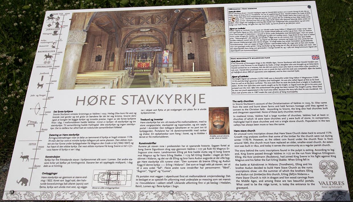Anhand einer außergewöhnlichen Runeninschrift lässt sich die Høre Stabkirche auf das Jahr 1179 datieren. Den Runen in den Säulen der Kanzel zufolge sei König Sverre 1177 auf der Flucht vor Magnus Erlingson durch Valdres gereist. Die Kirche ist reich an mittelalterlichen Drachen- und Löwenschnitzereien.