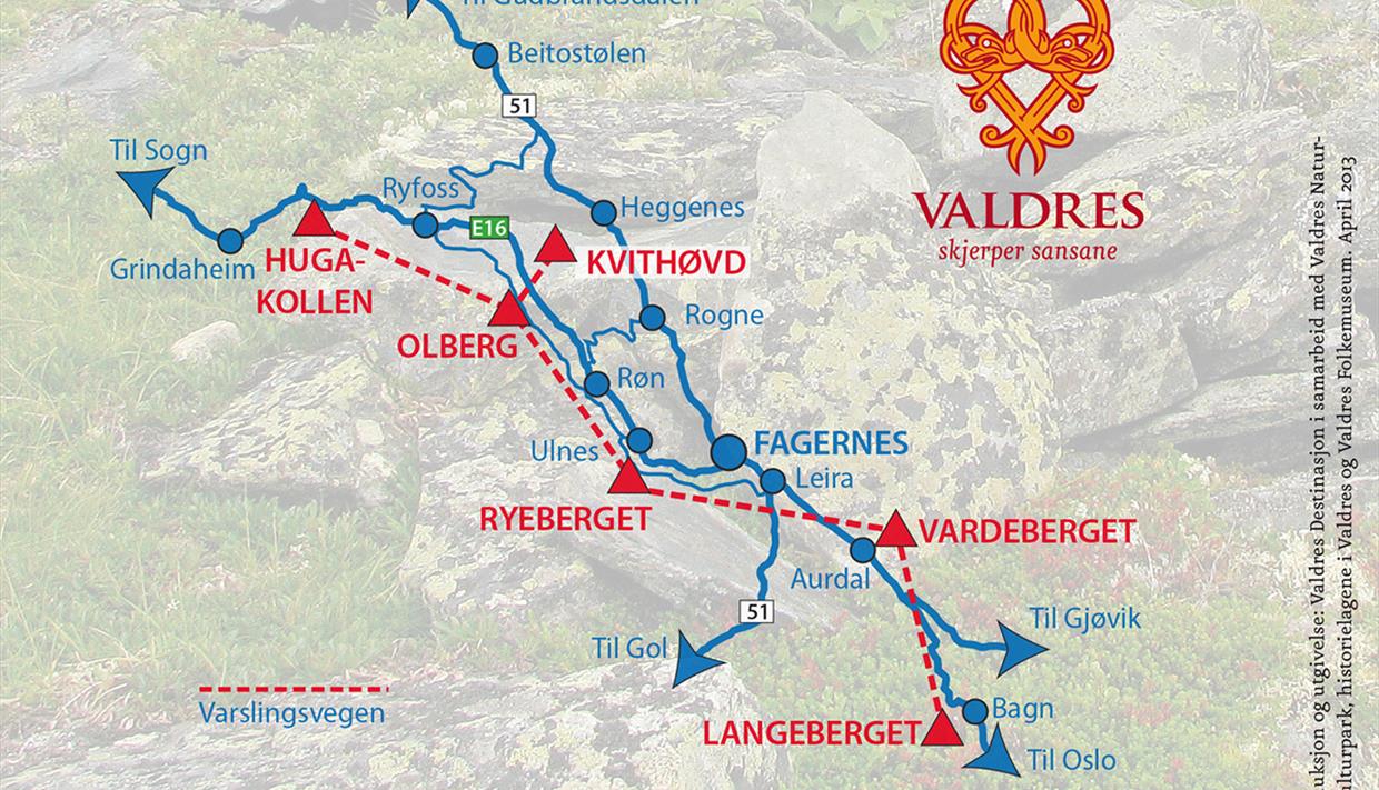 Gehen sie noch ein Stück weiter bergan und halten sich dann links. Nach dem letzten Wohnhaus geht die Straße in einen Traktorweg über. Am Holzplatz halten sie sich rechts bergan in Richtung Flatåsen. An der nächsten Wegkreuzung (ca. 150 m) biegen sie links in Richtung Kvithøvd. Der Traktorweg führt in einem Bogen hinauf zum alten Kvithøvd hotell. Hier auf dem großräumigen Gipfelbereich sind 3 Punkte ausgeschildert: Die Signalfeuerwarte (Vete), der höchste Punkt (toppen) und die Aussicht Richtung Vestre Slidre (Utsikt). Es lohnt sich, alle drei zu besuchen.