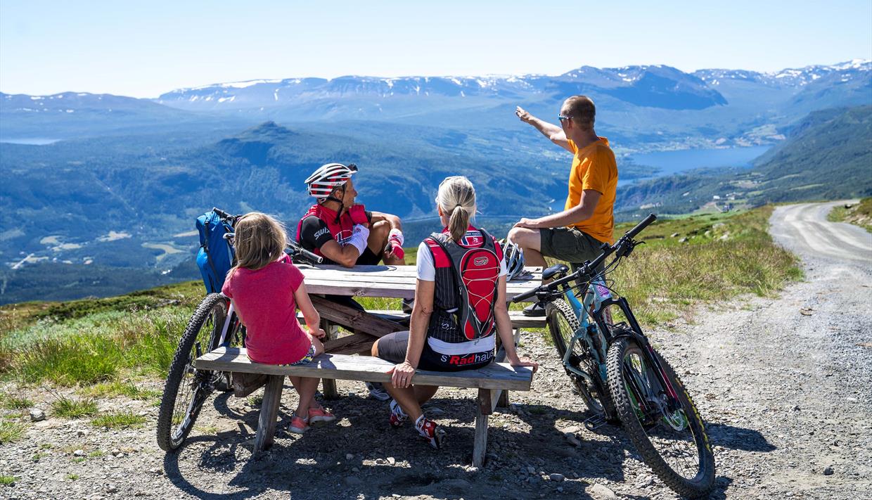 Tips: Möchte man die Tour auf zwei Tage verteilen, kann man eine Übernachtung bei Rogn Camping einplanen. Um hierher zu gelangen, biegen sie an der Dalsbrukreuzung (50 m vom Südende des Slettefjellvegens entfernt), in Richtung Åsvang ab und folgen der Ausschilderung den Tørpegardsvegen hinunter zu Rogn Camping (Frühstück kann gegen Vorbestellung im Kühlschrank der Campinghütte bereitgestellt werden). Am nächsten Tag radeln sie auf der E16 (vorsichtig!) ca. 4 km bis Kvismo, wo sie rechts auf den Nordabergsvegen abbiegen und diesem folgen, bis sie an der Abzweigung des Strøsvegen wieder auf den Mjølkevegen treffen.