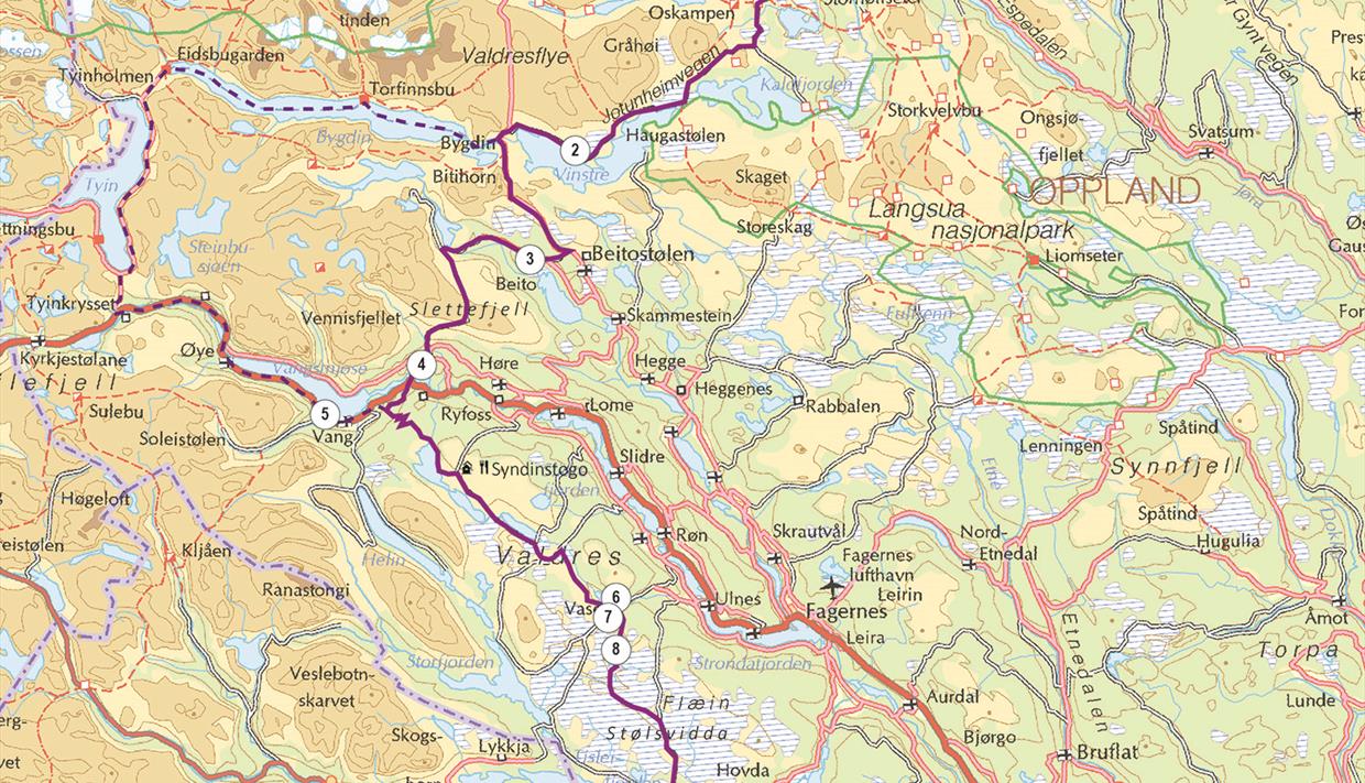 Der Slettefjellkiosk bietet sich für eine Rast zum "Auftanken" für Radler und ggf. der Fahrradbatterie an. Anschließend biegen Sie rechts und folgen dem Vennisvegen entlang des Nordufers des Sees Vangsmjøsa. Wenn sie am Westende des Vangsmjøsa die E16 erreichen, überqueren sie diese schräg nach links und folgen dem Strøndafjordvegen leicht bergan nach Tyinkrysset - teils auf Trailpassagen. In Tyinkrysset können E-Biker in der Touristinformation/Intersportgeschäft den Akku wieder aufladen; im Laden oder, falls geschlossen, an der Wand bei den Abfallbehältern. Ladegeräte für Shimano, Bosch und Yamaha können geliehen werden. Hier gibt es auch Übernachtungsmöglichkeiten.