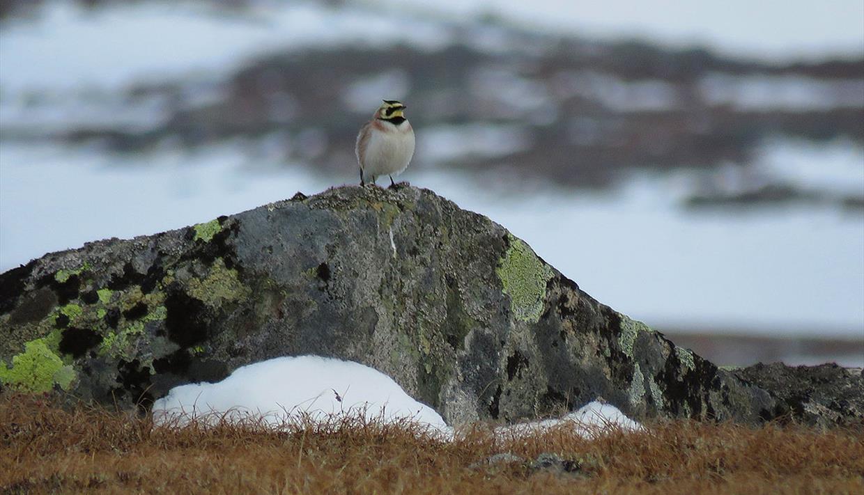 Viele Arten lassen sich direkt vom Auto aus beobachten, wenn man langsam über die höchste Partie fährt. Hier gibt es lange Seitenstreifen, so dass man den Verkehr nicht behindert. Besonders zeitig in der Saison, wenn die Straße nach der Wintersperrung geöffnet hat und noch viel Schnee liegt, sammeln sich die Vögel auf großen Steinen und schneefreien Flecken entlang der Straße und sind sehr einfach zu beobachten. Später ist es empfehlenswert, die Gegend zu Fuß zu erforschen. Ein guter Ausgangspunkt ist der Parkplatz am höchsten Punkt der Straße (Valdresflye 1389) oder der Seitenstreifen in der Nähe. Folgen Sie dem Wanderweg auf den Fisketjernnuten 1527 m (markiert mit Pflöcken mit roter Spitze). Im Vorsommer sind die Temminckstrandläufer leicht zu hören und zu sehen, während sie auf den und um die großen Steine nahe der Straße herum aktiv sind. Steinschmätzer und Wiesenpieper sind zahlreich und können nicht verfehlt werden. Weiter oben, ab ca. halber Höhe zum Gipfel, sind die Chancen gut, Ohrenlerchen zu sehen. Ihr Gesang verrät sie oft. Auch das Alpenschneehuhn lebt im Gipfelbereich des Fisketjernnuten. Vom Gipfelpunkt aus können Sie dem flachen Gipfelplateau in Richtung Norden zur Abbruchkante zum Heimdalen hin folgen. Hier, etwas unterhalb in den steilen Schneefeldern, sind früh im Sommer in der Regel Schneeammern zu finden. Nach Süden hin ist der Berg weniger steil, und es ist möglich, quer feldein in Richtung der östlichen Fisketjerni abzusteigen. Halten Sie am Fuße des Fisketjernnuten auf Steinfeldern nach Spornammern Ausschau. Suchen Sie die Seen Fisketjerni sorgfältig mit dem Spektiv ab, denn unter den Enten, die hier oft liegen, befinden sich manchmal Eis- und Bergenten.